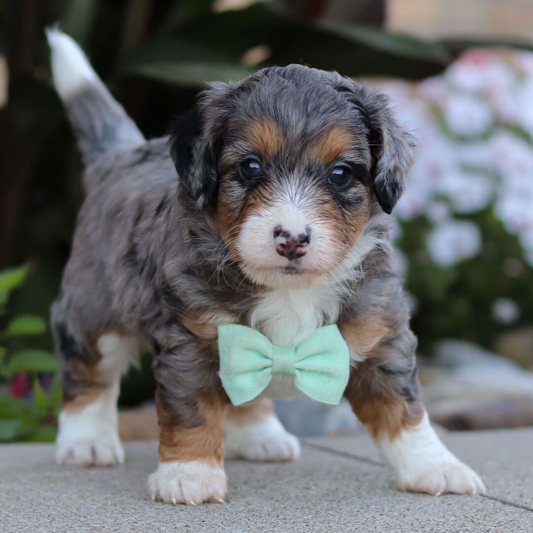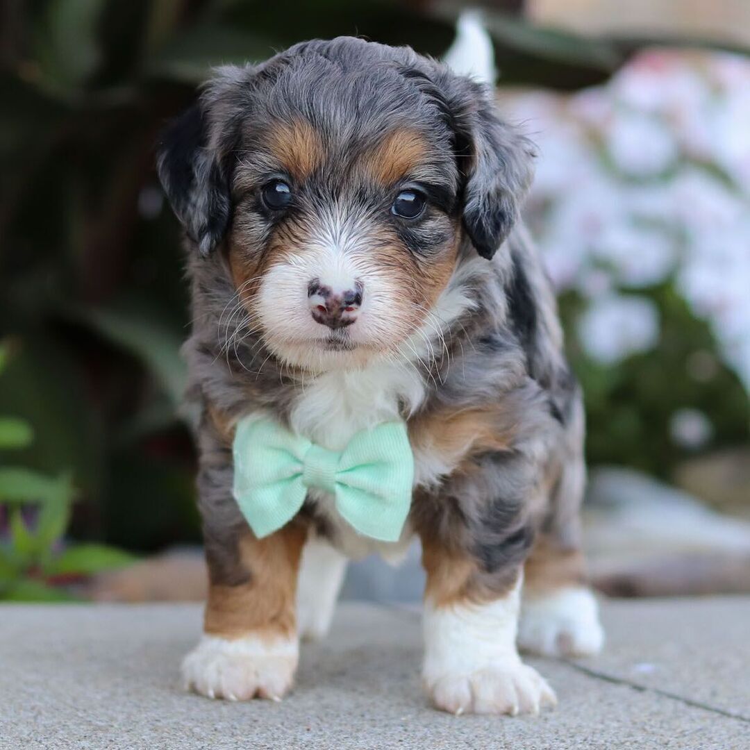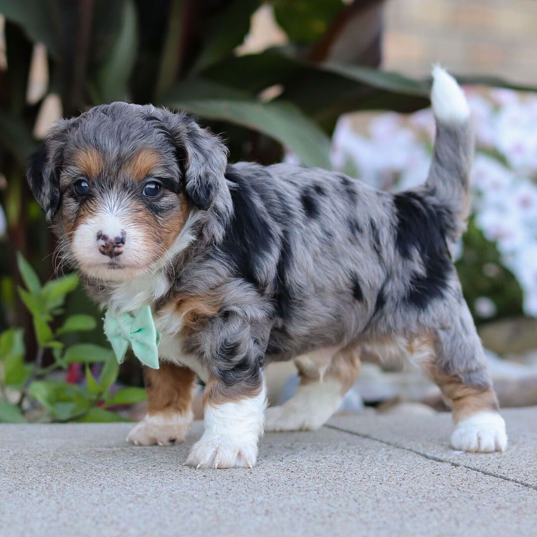 Hi there, I’m Snoopy! It’s a pleasure to meet you. I’m a very handsome 5-week-old male Bernedoodle with a truly special and one-of-a-kind coat. My fur is a stunning, beautifully patterned mix of blue merle, white, and tan, making me a true standout.
